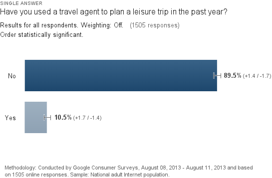 This week we asked consumers a somewhat retro and existential question: “Have you used a travel agent to plan a leisure trip in the past year?” The answer won’t come as a surprise to most of the world — except maybe travel agents — but the one-sidedness of the response surely shocked us. Almost 90 percent of them said no, and variation for various demographic factors across United States is minor, if at all.